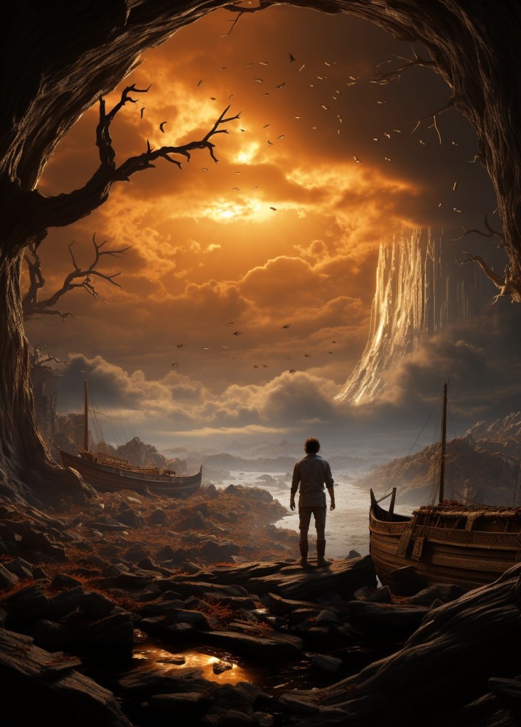 Bueno, ya sé que la portada planeada para Diluvio era otra, pero el miércoles 18 de octubre me escribe Antonio diciéndome: «Alberto, aunque sé que me vas a decir que no, te hago la siguiente sugerencia». Yo le respondí «Dime… otra imagen para diluvio?». La verdad es que los dos nos habíamos dado cuenta de que la portada de La columna de oricalco estaba espectacular frente una simplemente «buena» portada para Diluvio. Le faltaba algo de épica.
