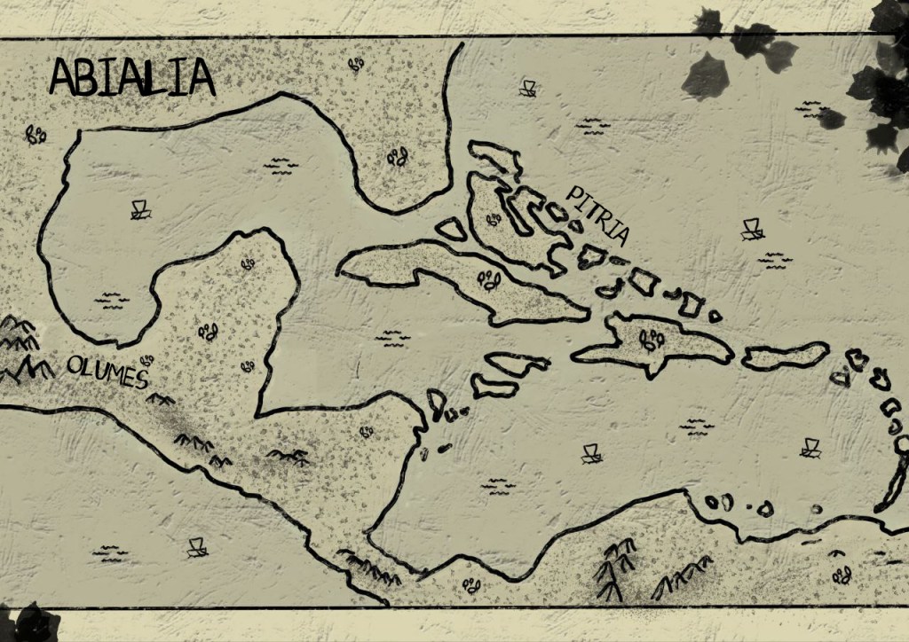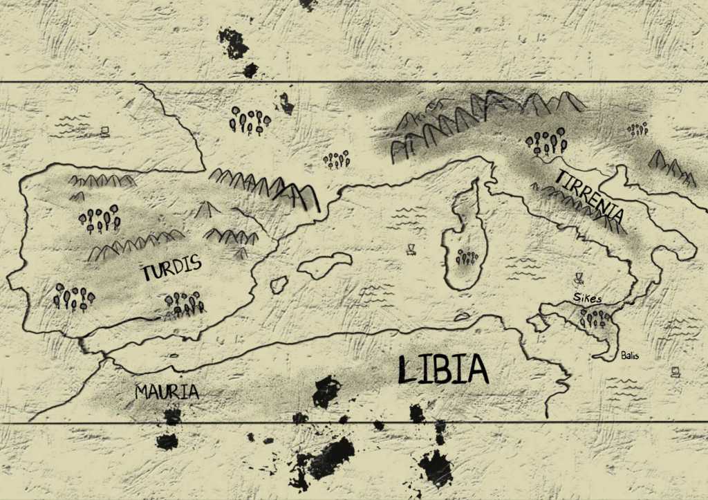 Este último nos costó más. En los anteriores nos fijamos en mapas del mundo recreados por científicos durante la Edad de Hielo, pero este había que inventárselo por completo. Le dije a Aitor que creara una isla convincente con algunas islas alrededor, le pasé un croquis de más o menos lo que quería y este fue el resultado. Decidimos finalmente ubicar dónde se ubicaba la capital: Atlantis y poner el nombre de los diez reinos. Azaia la ubicamos en las actuales Azores debido a la similitud entre el rey Azaes, fundador de ese reino con el actual nombre del archipiélago.